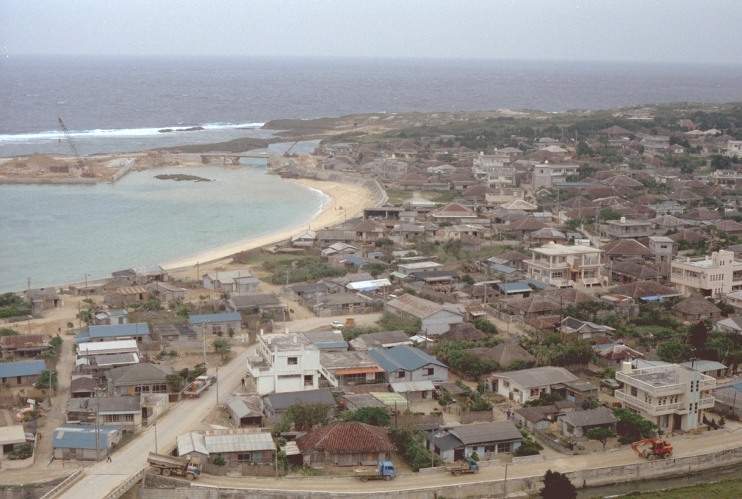 1981年当時。港は整備中で、民家も赤瓦屋根が多い。一部藁葺き家屋も見える。“湾岸道路”はまだ整備されていない。